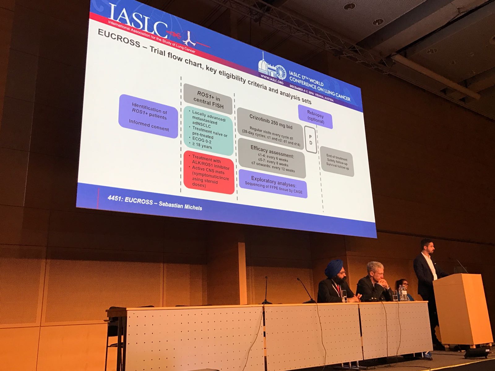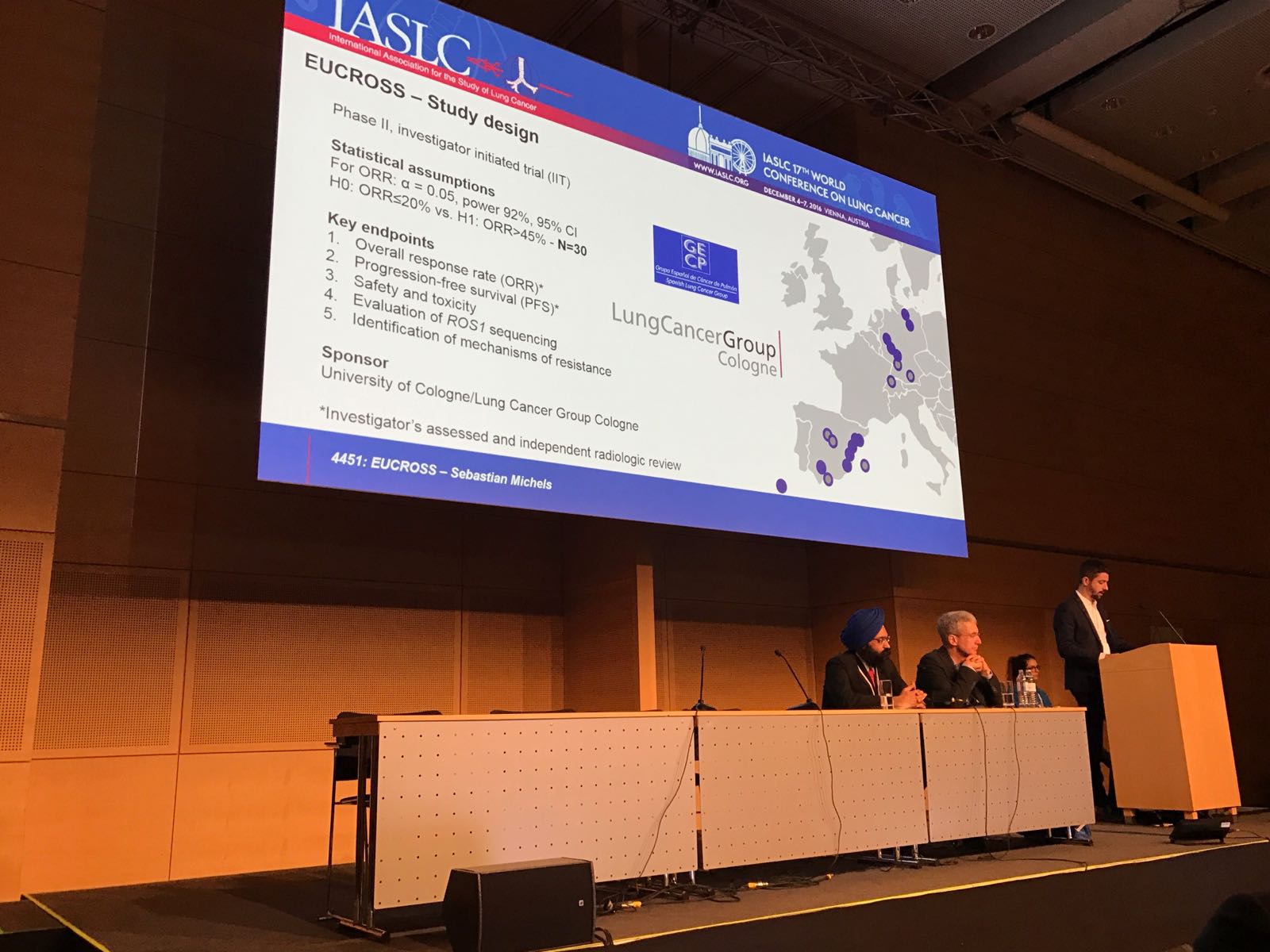 Wir sind stolz, dass Sebastian Michels auf dem diesjährigen WCLC, im Rahmen der Session „ALK-ROS1 in Advanced NSCLC“, erste Daten unserer EUCROSS-Studie präsentieren konnte. In dieser europäischen, einarmigen Phase-II-Studie mit Crizotinib an Patienten (N=30) mit ROS1-positivem NSCLC konnten wir eine beeindruckende Ansprechrate von 67% (95% CI: 47,1-82,2) bei insgesamt sehr guter Verträglichkeit zeigen. Auch nach einer Studiendauer von 2 Jahren und einem medianen Follow-up von 13,3 Monaten ist das mediane progressionsfreie Überleben noch nicht erreicht. Umfangreiche molekulargenetische Untersuchungen der Tumorproben sollen das Gesamtbild der Patientenpopulation welche von der Therapie profitiert präzisieren. Wir bedanken uns bei allen Netzwerkpartnern, die zum Erfolg der Studie beigetragen haben.